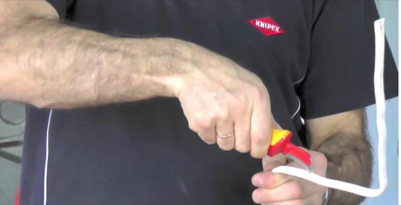 - Сделав разрез необходимой длины, нож извлекается, жилы высвобождаются из наружной оболочки, а она, в свою очередь, удаляется с помощью режущей кромкой лезвия.