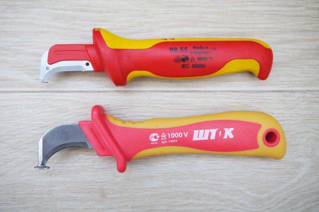- Рукоятка может и не иметь анатомической формы, главное, чтобы позволяла определять на ощупь остриё лезвия. Материал изготовления должен быть диэлектрическим, а также прочным (пластик, углеродистое волокно) для предотвращения удара электротоком при выполнении монтажных работ.
