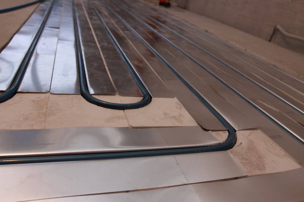 Прокладка отопительных труб на основание из полистирольных пластин не требует применения крепежа. Установка производится нажатием и фиксацией отрезка трубы в пазах между выпуклостями плиты. Следующим слоем укладываются металлические теплораспределительные пластины. Затем монтируется чистовое напольное покрытие