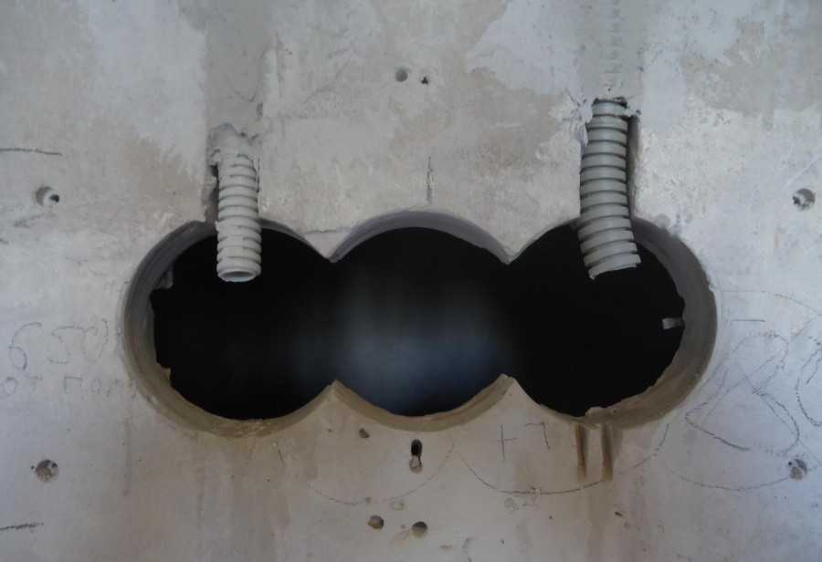 Далее все розетки, выключатели и места установки осветительных приборов соединяются ПВХ трубками в соответствии со схемой подключения. Трубки эти заглубляются в конструкции стен. При этом в несущих стенах из железобетонных панелей штробление не допускается. Трубки монтируются под слоем штукатурки. По потолкам проводка выполняется в трубах, замоноличенных в железобетон перекрытия, либо проводится в пустотах плит перекрытия. Если трубы не были замоноличены в перекрытия на стадии возведения коробки здания, то они также скрываются слоем штукатурки либо за конструкциями будущих подвесных или натяжных потолков в новостройке. На каждом участке трубки должны быть целыми, без стыков.