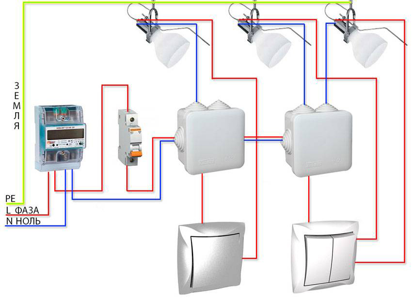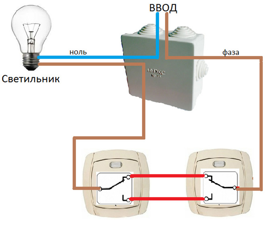 Принципиальная схема подключения проходного выключателя с 2-х мест