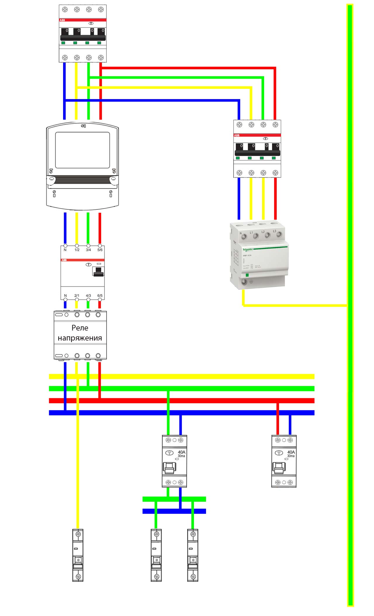 Схема качественно укомплектованного с точки зрения защиты от всех скачков и перепадов напряжения распределительного щита, должна выглядеть примерно следующим образом.
