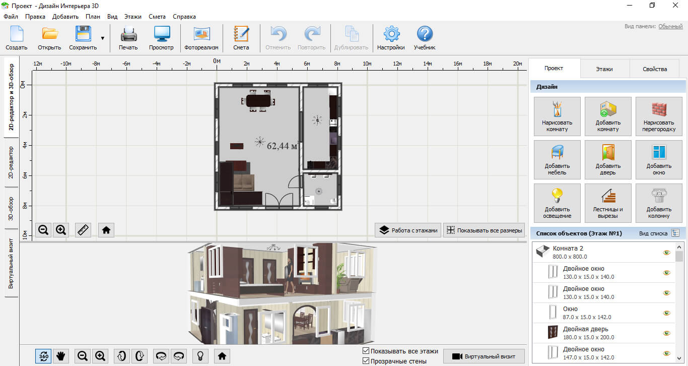 - Возможность одновременной работы с двухмерной и трехмерной моделью помещения;