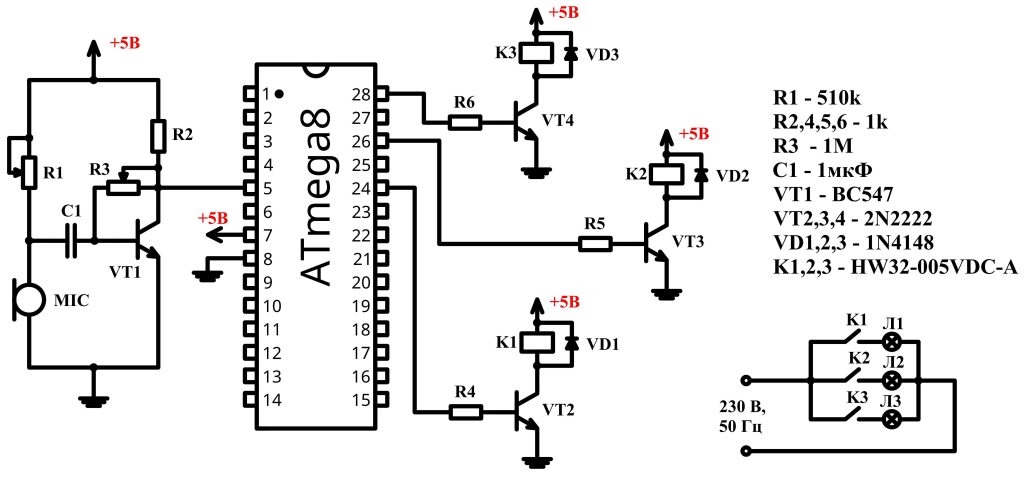 Далее усиленный сигнал подается на вход . В зависимости от количества поступивших импульсов, что соответствует количеству хлопков, микроконтроллер выдает высокий или низкий потенциал на соответствующие выводы. В данной схеме у нас применяются три вывода микроконтроллера МК, которые работают на выход. Они питают три аналогичные цепи. Рассмотрим работу одной цепи.