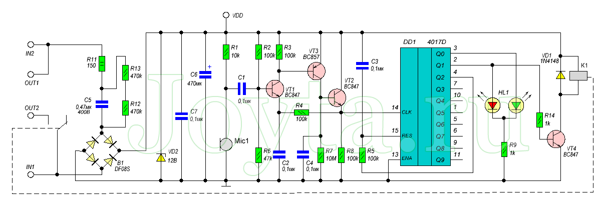 Благодаря наличию буферного транзистора VT2, после хлопка на резисторе R8, а значит, и на тактовом входе 14 микросхемы 4017 возникает положительный импульс. Он вызывает изменение состояния счетчика, который переключает свечения светодиода с зеленого на красный цвет, а так же через транзистор VT4 включается реле.