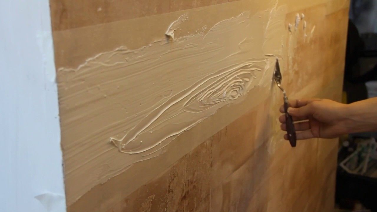 Шпатель не вызывает сложностей в работе, помогает легко создавать требуемые рисунки. Равномерно обработав стену перекрывающими друг друга мазками, вы создадите имитацию древесного среза. Остается только покрасить высохшую поверхность.