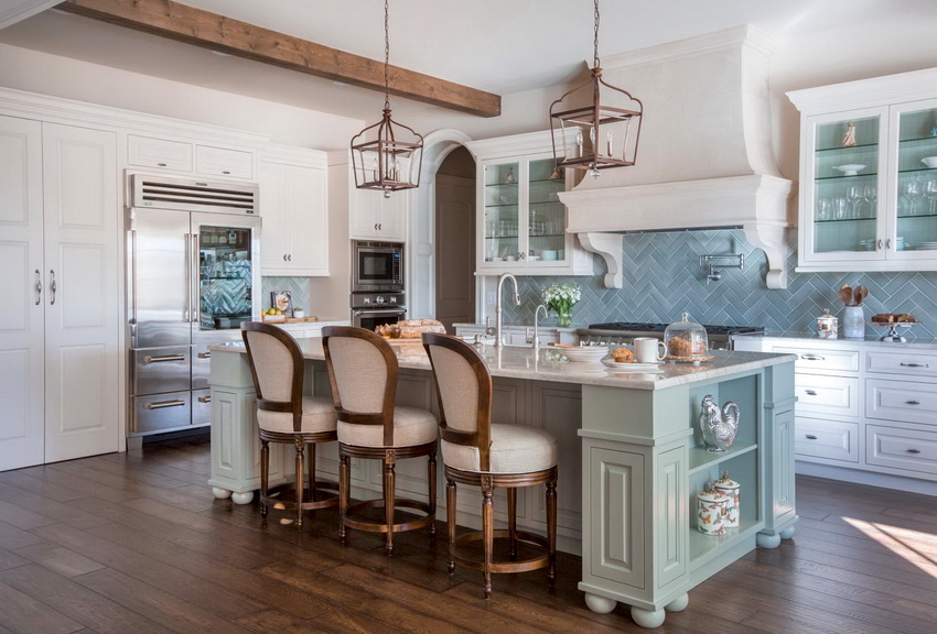 Стены часто отделывают штукатуркой, наносимой нарочито грубыми мазками. На пол укладывают плитку с имитацией каменной или древесной фактуры. Мебельный гарнитур со светлыми фасадами и характерными состаренными отметинами приобретают только изготовленный из дерева. Уместен будет функциональный шкаф-буфет.