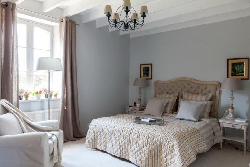 Спальня в духе прованс обычно оформлена в светлых спокойных тонах без лишних ярких деталей