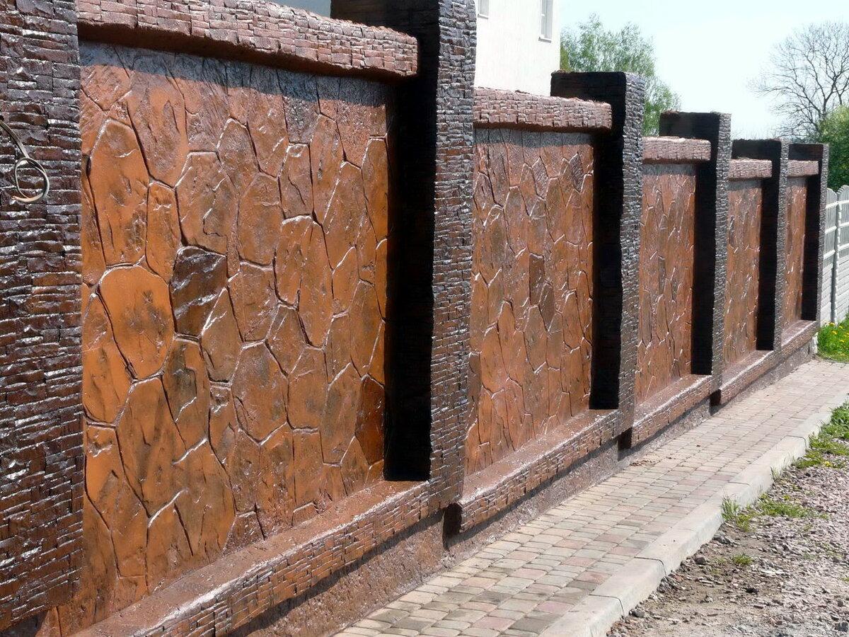Одна из них – это, так называемый, печатный (штампованный) бетон, который, будучи нанесённым на основание, в ещё пластичном виде обрабатывается инструментом для нанесения рельефа. Есть так же напыляемый декоративный бетон, и есть цветной, с помощью которого можно весьма достоверно имитировать кладку из камня или кирпича.