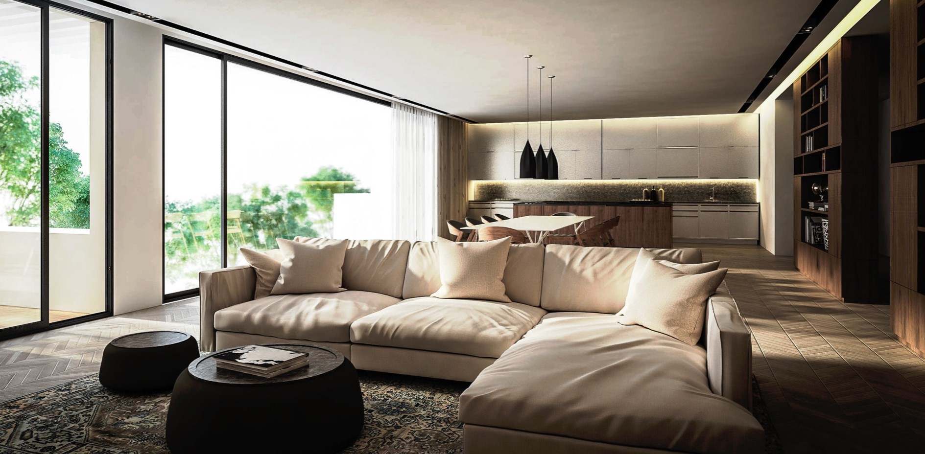 Каменный пол хорошо сочетается с деревянной мебелью в интерьере