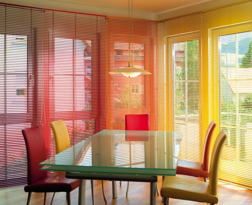 Дизайнеры главное внимание при этом отдают фактуре и материалам, ведь в застекленном помещении наш взгляд приковывают именно эти светозащитные устройства. Наиболее естественно выглядят здесь нитяные, тканевые ламели, а также завесы древесных фактур