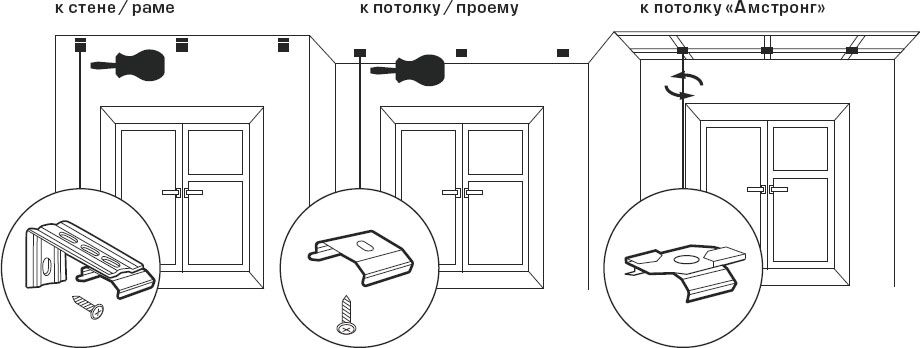 - Монтаж. По разметке необходимо закрепить все элементы конструкции, используя дюбеля и шурупы, которые вкручиваются либо в стену, либо в потолок. Затем на шурупы устанавливается карниз, на который фиксируются бегунки и ламели.