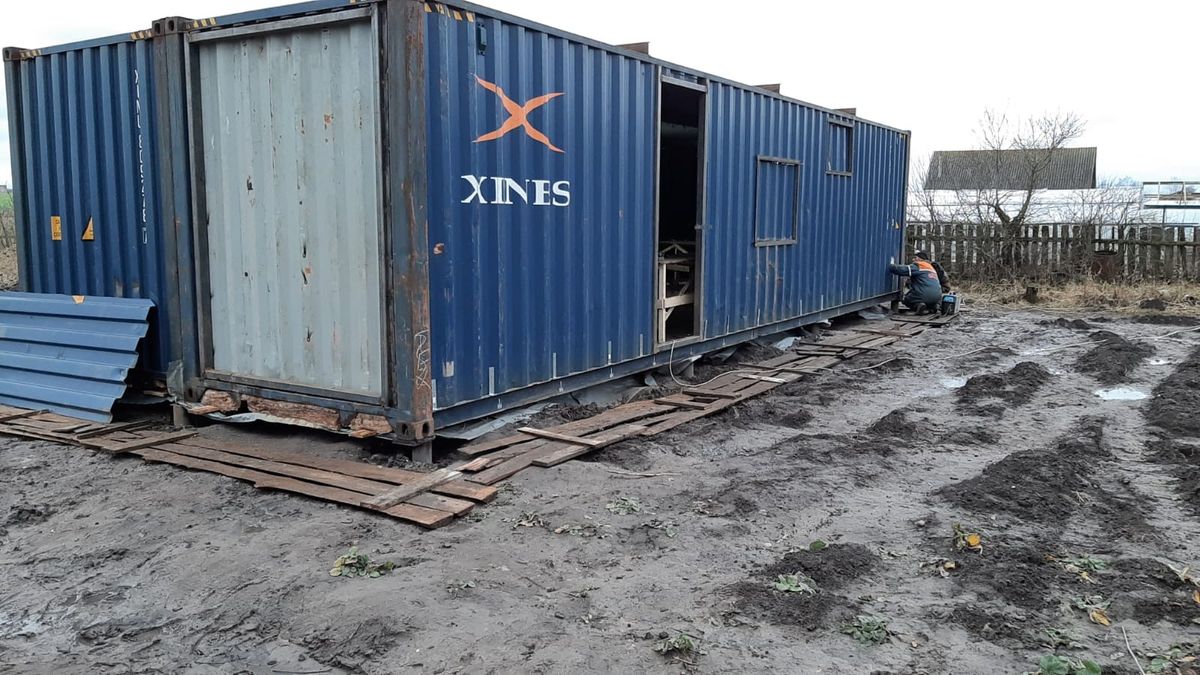 Пока одни работники занимались утеплением дна контейнеров, другие под будущий дом сделали свайно-винтовой фундамент. Потом пригнали кран и поставили на него контейнеры.