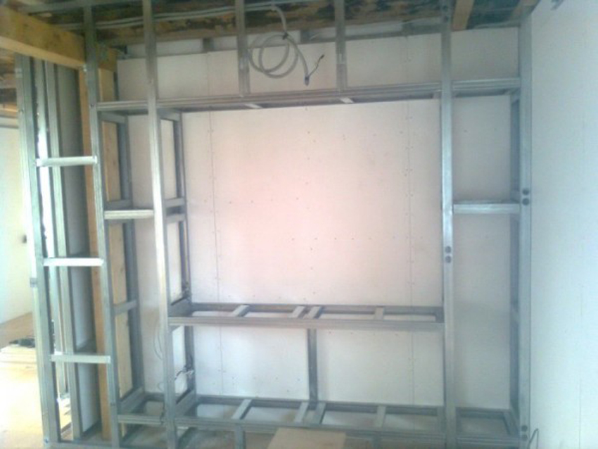 Чаще всего стены из гипсокартона с нишами создаются в комплексе. То есть при полной отделке помещения стоит спланировать, где в каркас внести конструктивные изменения для создания углубления. Как следствие такого подхода, понадобится тот же материал для основания, что и для общей обшивки стен панелями ГКЛ.Чертеж и конструкция ниши из ГКЛ в гостинойКаркас собирается из металлических профилей соответствующего назначения: