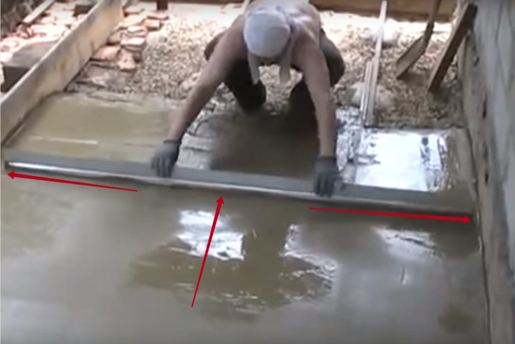 Т.е. аккуратно двигаем правило вправо/влево, то в одну, то в другую сторону, одновременно смещаясь к себе так, что излишки раствора перемещаются сверху на еще незаполненное им пространство пола, к нам под ноги.