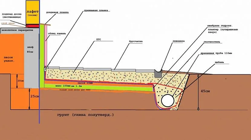 Конструкция отмостки – сложное сооружение, состоящее из двух или трёх слоёв (декоративное покрытие, гидроизоляционные настилы, утеплители).