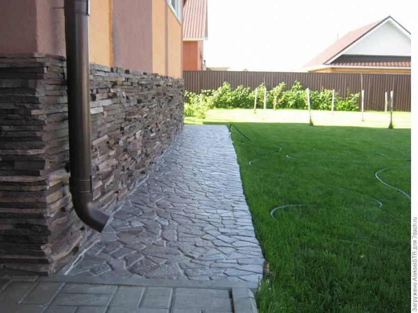 Для стока воды по наружному краю отмостки делается мелкие камешки. Тут можно вымостить из камня канавки. Снизу застилается гидроизоляция. Можно просто распилить вдоль и выложить асбоцементную либо пластиковую трубу.