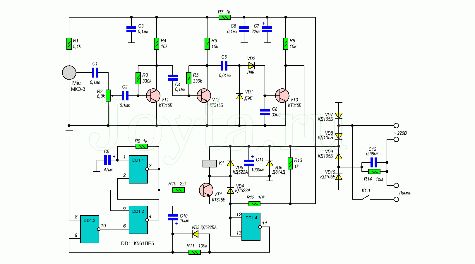 В темноте по щелчку включается свет, при дневном освещении выключается. Микрофон чувствительный, поэтому схема срабатывает даже на голос.