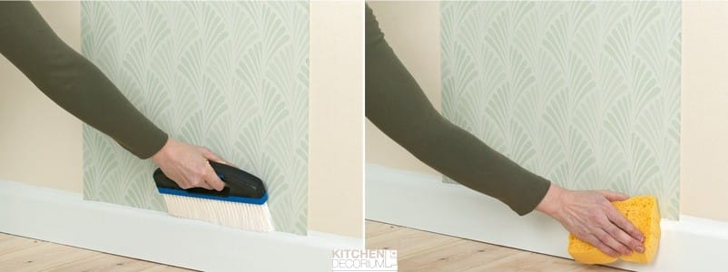 Затем следует контроль качества приклеивания – обои должны плотно прилегать к стене без воздушных пузырей. После того, как вся комната будет оклеена и полотно немного просохнет, можно подрезать излишки, образовавшиеся вверху и внизу