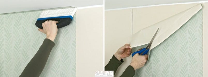 - Обрезаем ножом излишки обоев снизу. Это можно делать сразу или дождаться высыхания клея.