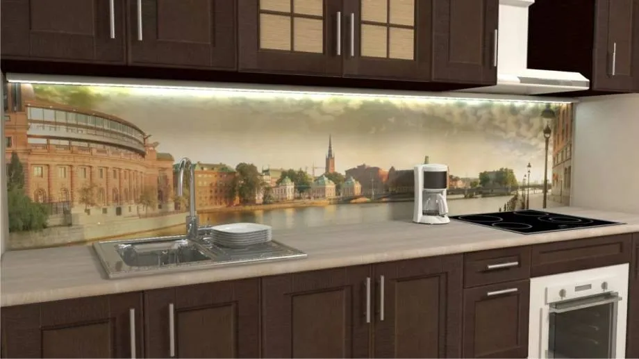А вот это довольно неплохой выбор из бюджетной серии. Смотрится великолепно, на него можно нанести любой рисунок посредством фотопечати, и он будет выглядеть ничуть не хуже, чем стеклянный фартук. Нет, тут мы конечно перегнули палку…
