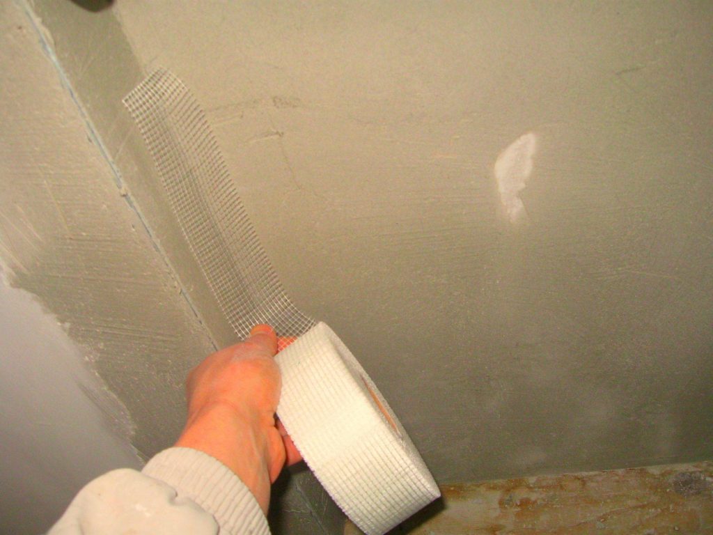 После заполнения, пока состав еще не высох, его проклеивают сеткой серпянкой или бумажной армирующей лентой. Это необходимо чтобы на стыках на образовывались трещины. Если используют ленту, ее разрывают на нужные куски, замачивают в чистой воде минут на 10 (пока заполняют шов).