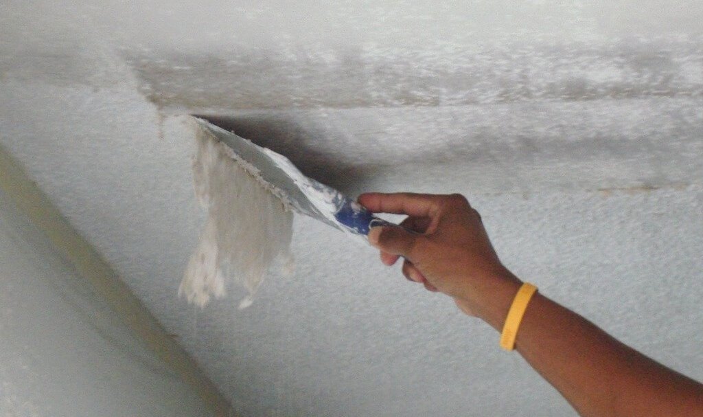 В случае если на потолке нанесено акриловое водостойкое покрытие, можно применить фен, смывку, или электродрель с металлической щёткой (очень пыльный метод!).