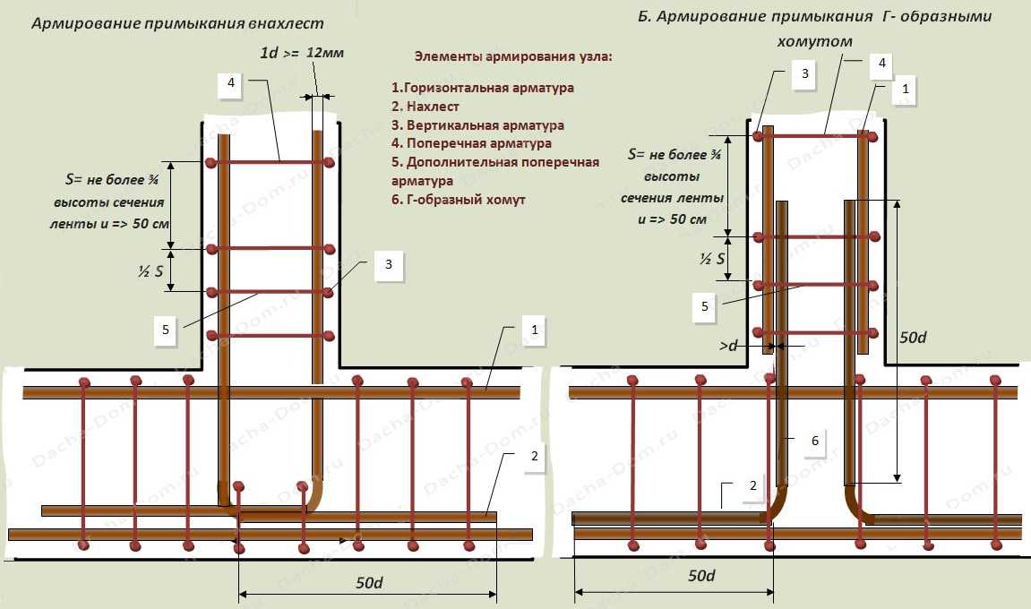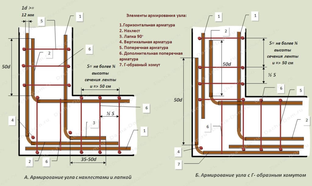 Но как правильно вязать арматуру для ленточного фундамента по углам? Существует два типа угловых соединений: между двумя перпендикулярными конструкциями и в месте примыкания одной стены к другой.