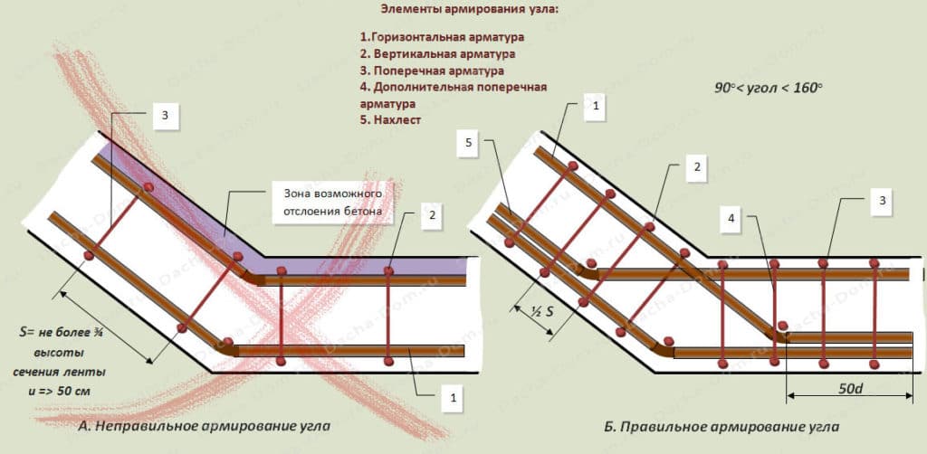 Как правильно армировать ленточный фундамент на тупых углах. Для этого внешний стержень изгибают до нужной градусной величины и прикрепляют к нему дополнительный в качестве усиления. Внутренние элементы привязываются к внешнему.