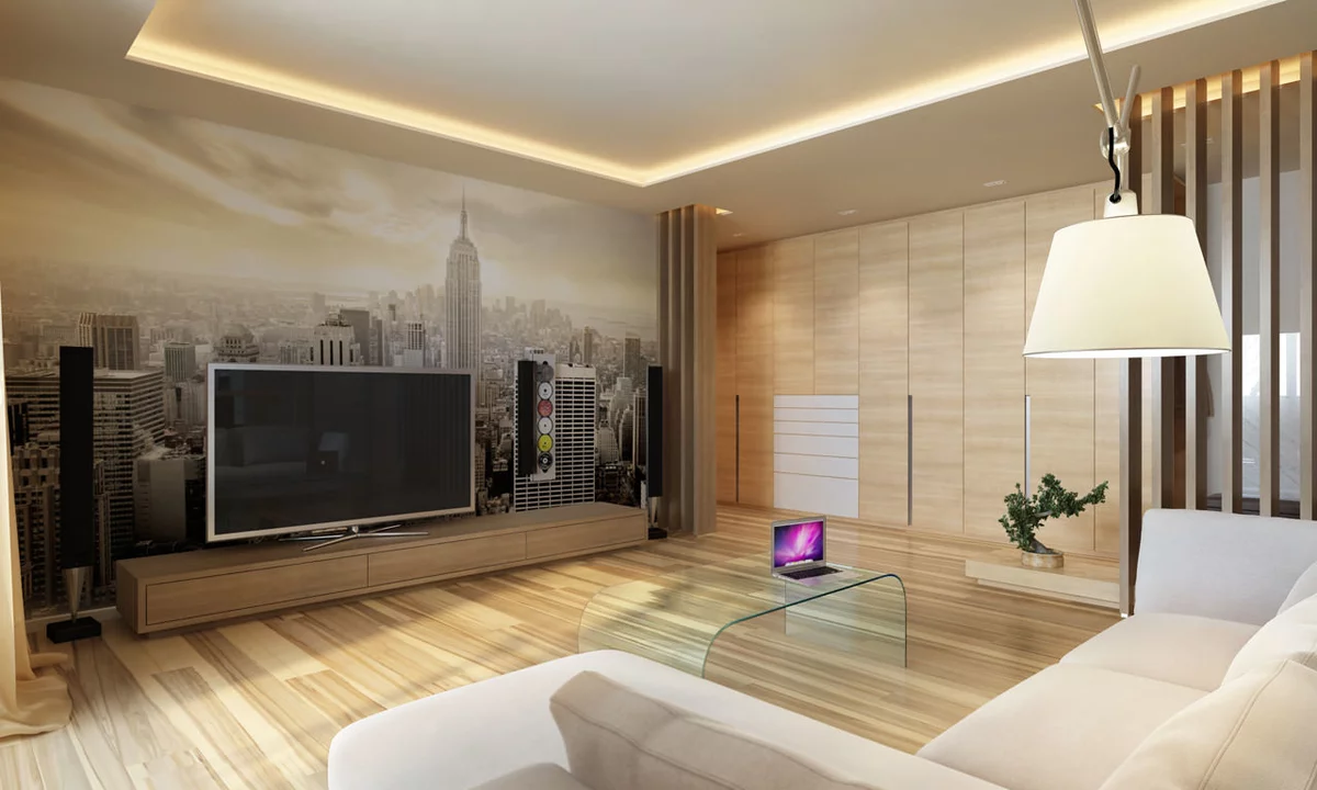 Зал может быть отделан как одним типом обоев, так и разными материалами. В условиях маленького помещения подойдут оба варианта. В интерьере гостиной можно сочетать разные узоры и цвета, выделяя некоторые области с помощью фотообоев или зонировать пространство.