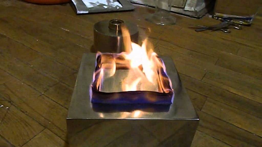 Топливный бак с горелкой обычно устанавливают на площадку или помещают в прозрачную емкость, материал которой способен выдерживать повышенные температуры горения огня.