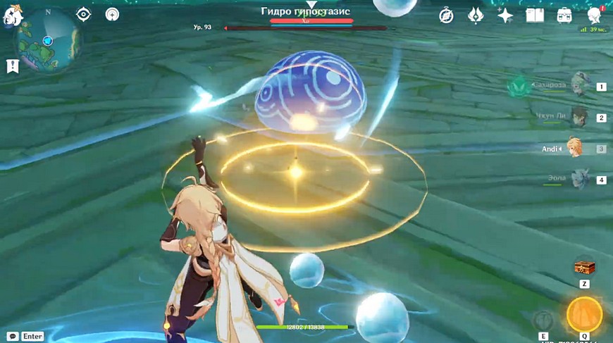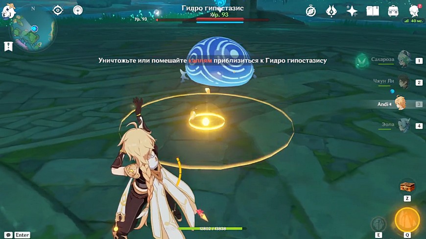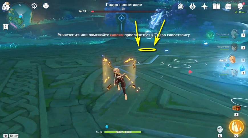В тот момент, когда Гидро гипостазис застывает в центре, переключайтесь на Гео Путешественника. Проследите траекторию, куда должен упасть один из созданных слаймов, и бегите в предполагаемую точку.