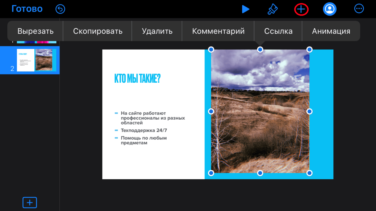 Также в процессе работы на презентацию можно добавлять различные рисунки и изображения. Для того чтобы сделать это пользователь должен нажать на кнопку плюсика, которая расположена вверху панели. Далее должна открыться библиотека мобильного устройства, из которой потребуется выбрать необходимые объекты.