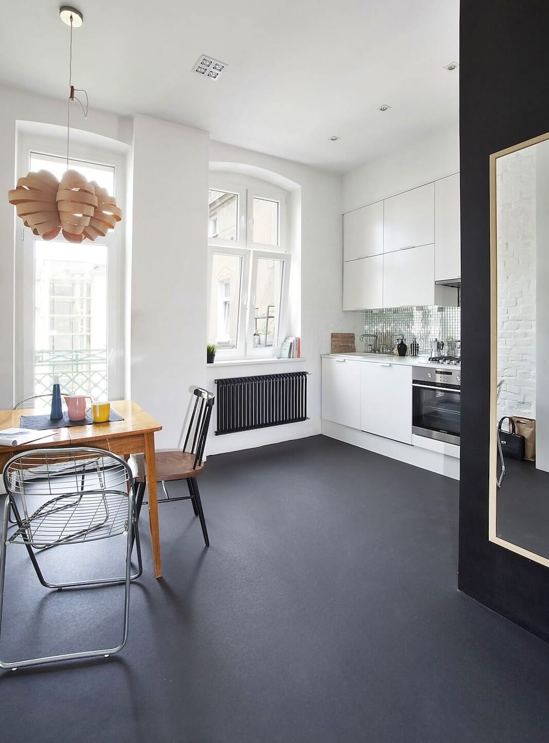 На таком покрытии не остаются разводы и пятна, для удаления появившихся загрязнений, можно использовать растворители или другие химические средства. После проведения влажной уборки, достаточно протереть пол сухой тряпкой и он будет снова выглядеть как новый.