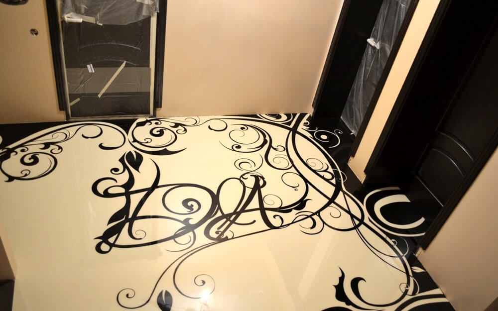 - Следующий этап – нанесение изображения. Данный процесс является наиболее ответственным, так как именно от выбора рисунка или текстуры зависит внешний вид будущего пола. Чаще всего в данном случае используется баннерная ткань с термической печатью. Также можно сделать выбор в пользу виниловой пленки. Само по себе полотно с изображением должно быть немного больше комнаты. Уже после всех работ можно будет обрезать лишние части материала. Очень часто хозяева сами создают рисунки на полотне. Для этого используются акриловые или полимерные краски. Конечно же, без опыта в рисовании лучше не пытаться создать нечто оригинальное, так как затея может очень легко провалиться. Лучше всего воспользоваться услугами типографии, в которой качественно нанесут любой рисунок на поверхность огромного полотна. Очень часто вместо изображений на 3D-полах используют различные элементы декора. Это, как уже говорилось, это могут быть декоративные камни, монеты или плоские фигурки. Также нужно защитить созданный рисунок при помощи лака. Слой защитного материала наносится на поверхность тонким слоем, однако нужно следить за тем, чтобы не было пропусков.