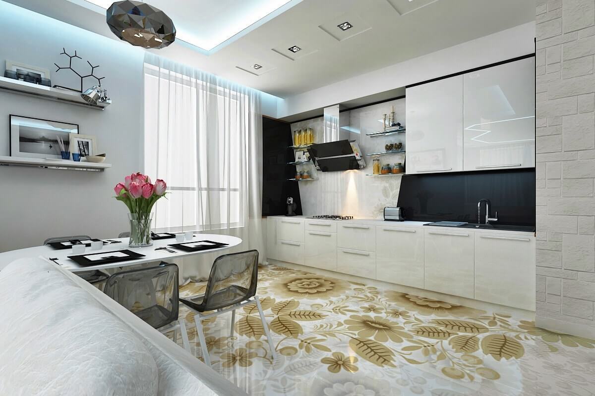 Наливной пол в кухне – залог стильного интерьера и безукоризненной чистоты. Такое покрытие всегда безупречно в отношении внешнего вида и легко отмывается от любых загрязнений, совершенно не страдая от воздействия моющих средств. В отношении цвета и рисунка всё зависит от размеров комнаты и общего дизайна.