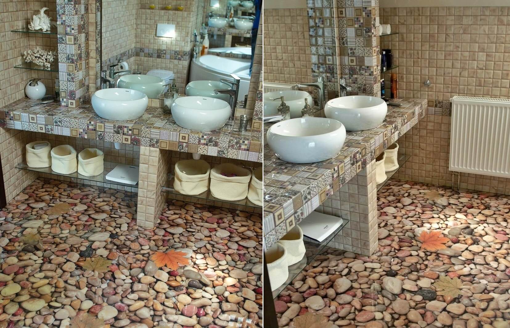 Трехмерные полы идеально смотрятся во всех комнатах, но вопрос, как сделать 3D пол в ванной, звучит чаще всего, но для этого комната должна иметь достаточные размеры, а чтобы полы выглядели идеально, сверху баннера наносится прозрачный полимерный финишный слой.
