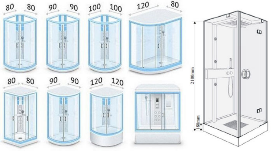Выбор габаритов зависит от свободной площади в комнате. Определитесь с местом; измерьте ширину, длину, возможную высоту. Для небольших помещений можно подобрать модель 80*80 см, для любителей просторных душевых – 150*150 см.