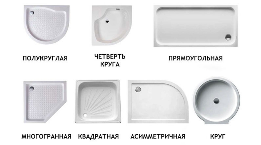 Выбор формы зависит от места расположения душевой. Поддон, прилегающий к стене, может быть квадратным, прямоугольным, в виде полукруга. Если встраиваете модель в угол, смотрите прямоугольные, квадратные, варианты в форме четверти круга.