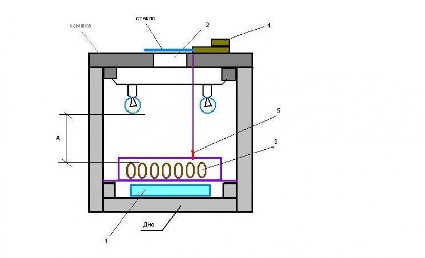 - Как и в предыдущей конструкции, лампочки рекомендуется вставлять в верхнюю крышку на расстоянии около 15 см от яиц.