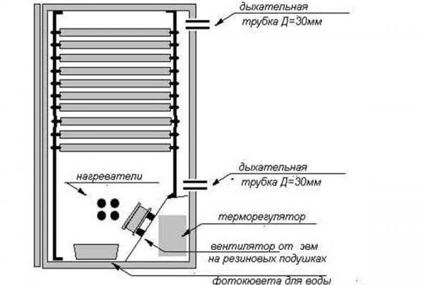- Терморегулятор, лампочки и вентилятор вмонтируйте в нижней части стенки, чтобы воздух от вентилятора нагревался от лампочек.