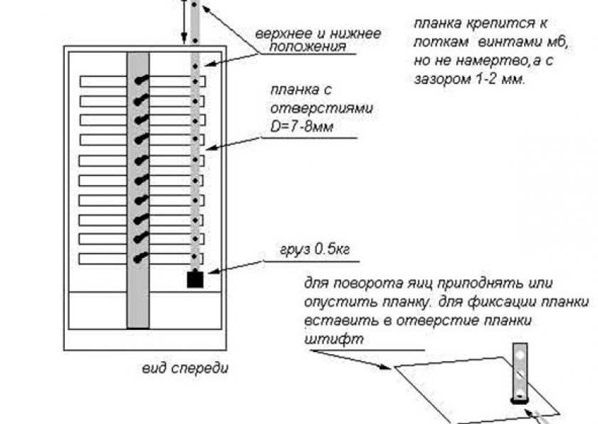 Для поворота выложенных яиц используют специальный поворотный механизм, который должен срабатывать не менее двух раз в день. Выделяют две основные разновидности систем, которые используются в инкубаторах: