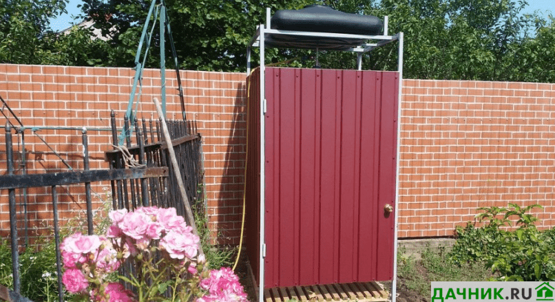 Этот душ получается долговечным, крепким и лёгким. Поэтому многие устанавливают его на дачных и приусадебных территориях. Профильный настил крепится к металлическому каркасу (из профтруб или уголка).