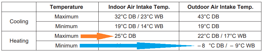 Рабочие температуры кондиционера на обогрев, указанные в спецификации.
