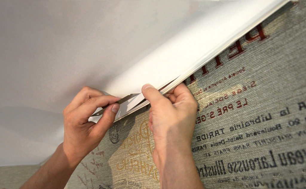 Если работы будут проводиться в обратном порядке, то нанесение обойного клея и наклеивание самих обоев будет сопровождаться страхом запачкать полотно. К тому же, если обои требуют совпадения рисунка, то неизбежна подрезка обойной полосы у самого потолка, что чревато испортить полотно режущим инструментом. Проще, конечно, когда обои не нужно подгонять по узору, тогда тщательно порезанные полосы обоев избавят от необходимости проводить подрезку под натянутым полотном.