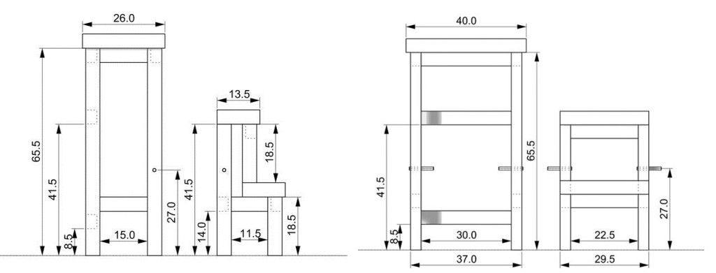 Чертежи всех основных элементов, которые будут нужны, с размерами представлены на фото. На них проставлены все необходимые размеры и при распилочных работах строго соблюдайте их, чтобы стремянка стул выглядел идеально.