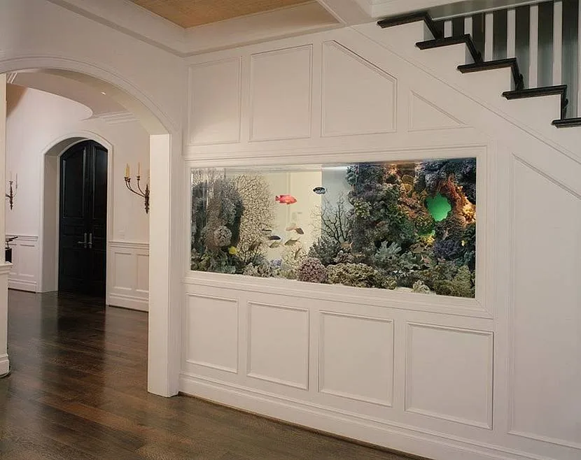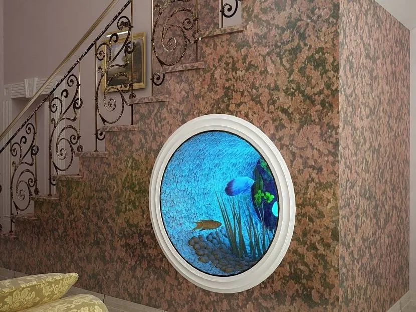 Пространство под лестницей обустраивают под кусочек подводного мира. В нише эффектно смотрится наклонный резервуар на всю стену. Конструкция может повторять форму ступеней, напоминать круглый иллюминатор или быть традиционной прямоугольной. При винтовом подъеме на второй этаж монтируют модель в виде цилиндра.