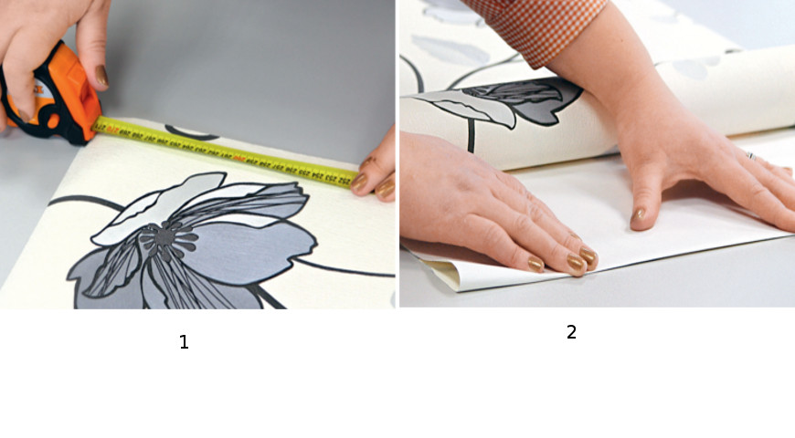 Чтобы обеспечить стыковку рисунка, каждое следующее полотно вымеряют по предыдущему. Поэтому удобнее перед началом расклейки нарезать обои на всю комнату или хотя бы на одну из стен. Отмерьте полотно по высоте стены (1), согните по линии отметки (2).