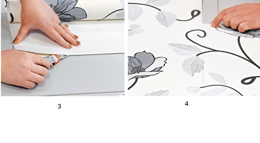 Разрежьте по сгибу ножом для бумаги (3). Идеально ровный срез не нужен – край обычно закрывается бордюром или плинтусом. Раскатайте рулон вдоль отрезанного полотна и совместите рисунок (4). Отрежьте новое полотно по размеру первого.