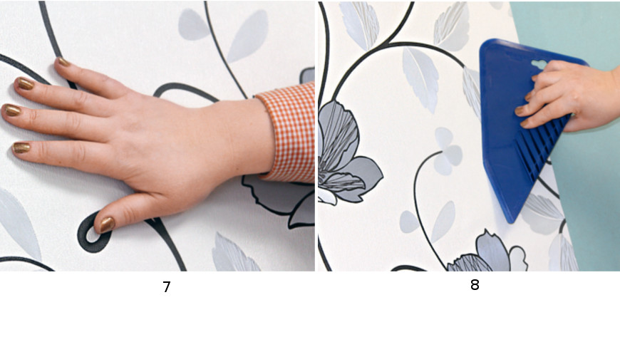 Мелкие пузырьки, неровности удобно удалять с помощью обойного валика. Прикатайте сначала середину полотна (9), затем азгладьте обойное полотно по направлению от середины к краям (10).